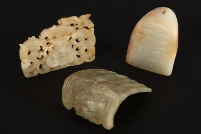 comprising of a panels, belt hook and pendant, a/f (damage to panel) length 6.5cm, 6cm, 5cm (3)