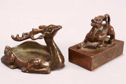 in the form of a stag, depicted seated with head raised, height together with a bronze seal, with mythical creature to top and engraved script to sides and seal to base, height 5.5cm (2)
