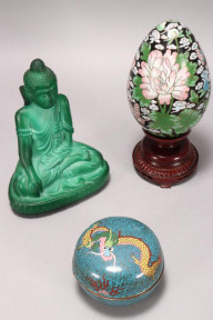 comprising large cloisonne egg on stand, a/f (minor damage to top), height with stand 24cm, closionne box and cover decorated with dragon on a blue ground, a/f (dent to cover rim), diameter 11.5cm, and a glass faux malachite deity, a/f (damage to nose), height 21cm (3)