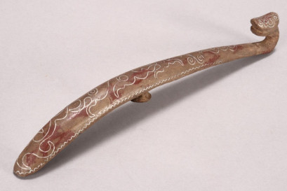 of tapering form, set with the head of a mythical creature, decorated with inlaid scrolling motifs, length 30.5cm