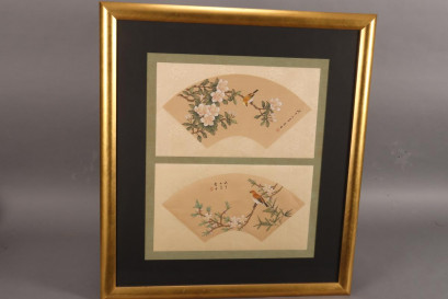 each in the form of a fan and hand painted with a bird on a blossoming branch, with inscription and seal mark, 26cm x 46cm (fan mount), set within a large gilt frame, 87cm x 78cm (frame)