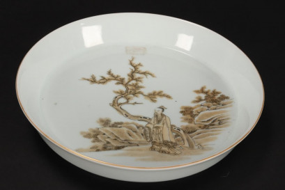 of tapering form, interior decorated with scene of man in an outdoor setting, in tones of brown and pale blue accented with gilt rim, seal mark to base, diameter 20cm -