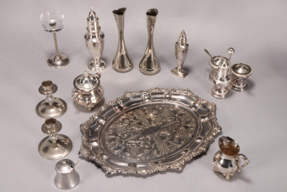 comprising of tray, open salts, caster, shakers, candlestick holders, cruet set and vases (qty)