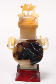 of faceted form, with pierced foliate finial, set with twin acanthus handles, decorated with stylised foliate motif, raised on a rectangular foot, in agate tones with a dark drown inclusion, on wooden stand, height 14.5cm (including stand)