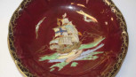 painted sailing ship decoration on burgundy ground, marked to base, (diameter 25cm approx). -