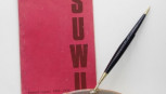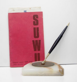 Ballpoint pen & stand on a marble base. Used by Princess Anne to sign visitors book at the 1969 meeting of the Sydney University Womens Union. Supporting documentation attached. -