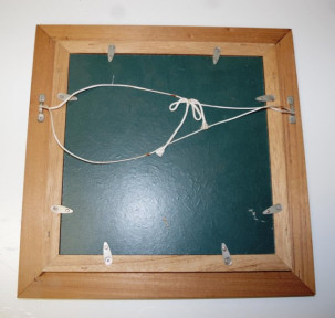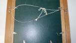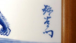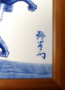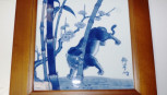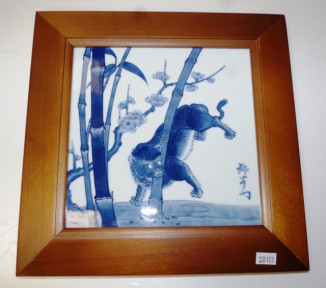 blue and white painted monkey depiction on ceramic tile, signed in characters lower right, enclosed in wood frame, (plaque 19cm X 19cm approx). -