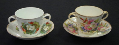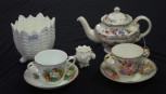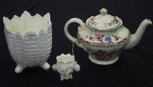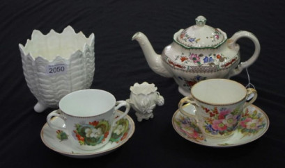 including: a Spode 'Chinese Rose' teapot, (height 16cm approx); a Coalport 'Countryware' table vase, (height 14cm approx); a decorative miniature posy vase, with applied decoration;and 2 antique large double handle cups and saucers, painted blossom decoration. -