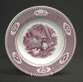 transfer printed decoration of figure with sheep to centre, marked to base J.M. & S, with coat of arms, (diameter 26.5cm approx). -