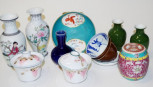 a total of approximately 10 various ceramic pieces, including: lidded bowls, pair painted table vases, lidded jar, and 3 various small glazed posy vases.