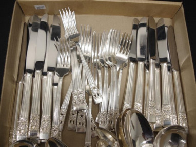 settings for 8, including: dinner knives and forks, entree knives and forks, soup spoons, and dessert spoons, and 14 teaspoons, together with 6 serving spoons, and and a serving fork, and ladle. -