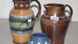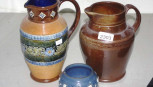 including: brown jug, (height 20cm approx); a small blue glaze bowl, with figural decoration, (height 8cm approx); and a decorated glazed jug, (lid missing), (height 22cm approx). -
