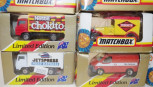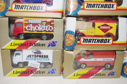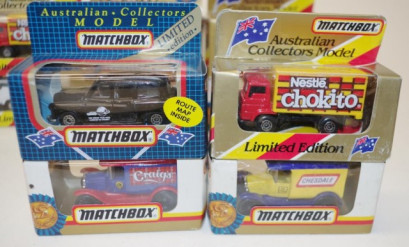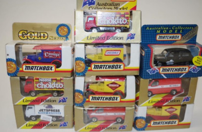 including Australian Collectors model Limited edition London Taxi (MB-04), two Chokito trucks (MB 72), Two Aust. Post Ford transit vans (MB-60), Delivery Truck MB 72, Two "Gold" series 1921 Model "T" Ford Vegemite, 1921 Model "T" Ford Chesdale, 1921 Model "T" Ford Craigs -