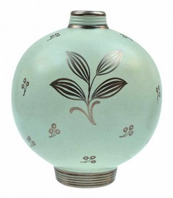 Celadon glaze and of a globular form with applied silver lustre geometric leaves, with a short fluted neck and foot, incised Wedgwood and NW marks to base, 20cm high. -