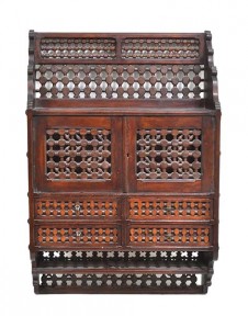 Rectangular, with a gallery edged open shelf about two doors opening to four drawers, a further two drawers below, each inset with a Musharabiyah-style panel, 62 x 91 x 20cm. -