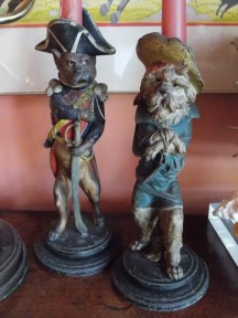 Lot Description:A pair of painted spelter satirical candlesticks of dogs dressed as men
