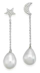 Each terminating in a 11.00mm cultured pearl drop suspended from a celestial motif surmount pavé set with brilliant-cut diamonds, mounted in 18ct white gold, length approximately 65mm, signed Paspaley. Accompanied by a Paspaley box. -