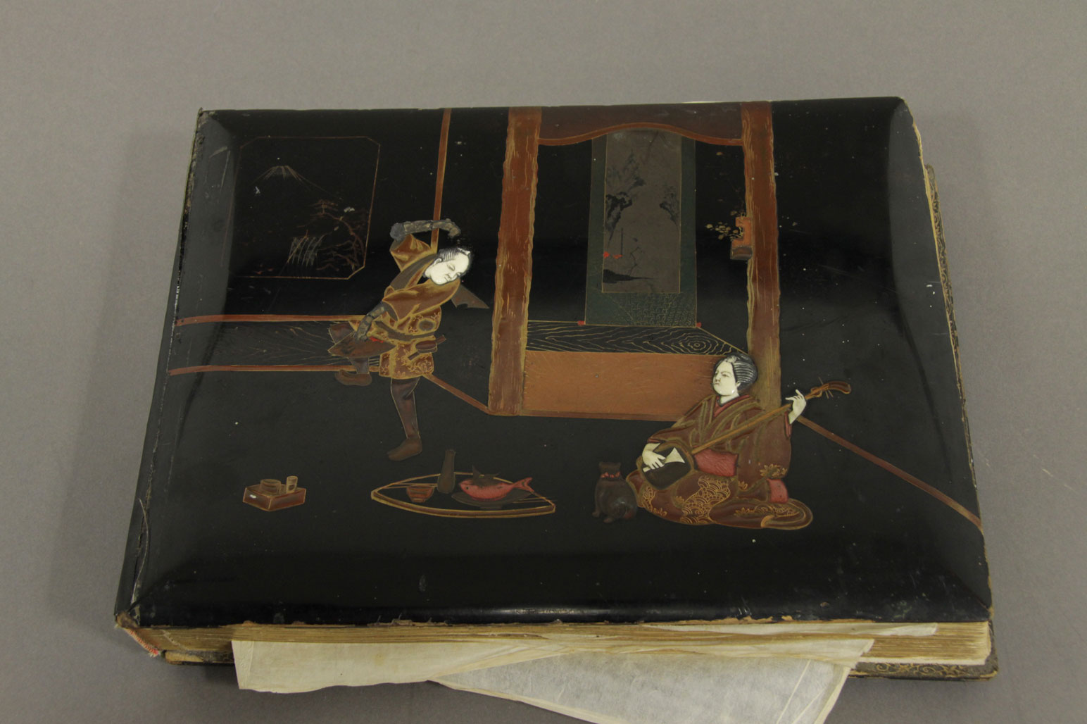 with a decorative lacquered dancing scene cover, binding loose. 49 images some distressed.