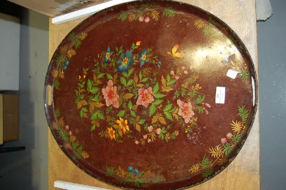 Lot Description:Antique French tole ware serving tray with hand painted floral decoration