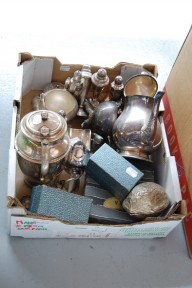 Lot Description:Collection of silver plated items to include salt & peppers, pots, etc