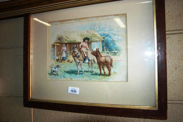Lot Description:Antique watercolour young girl with donkeys in a farmyard,