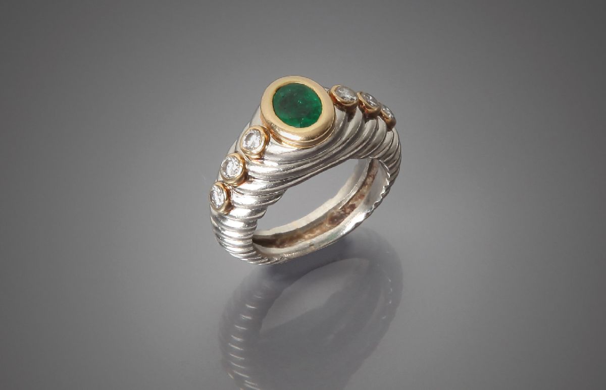 Lot Description:French antique 18k yellow gold emerald and diamonds ring