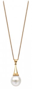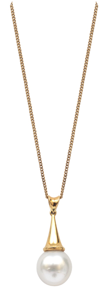 The round pearl of silver white hues measuring 13.03mm, suspended on a conical bale, in 18ct gold, with papers. -