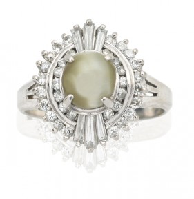 Of cluster design, centrally set with an oval chrysoberyl cut en cabochon, surrounded by round brilliant and tapered baguette cut diamonds, in platinum, independent valuation available, ring size M-N. -