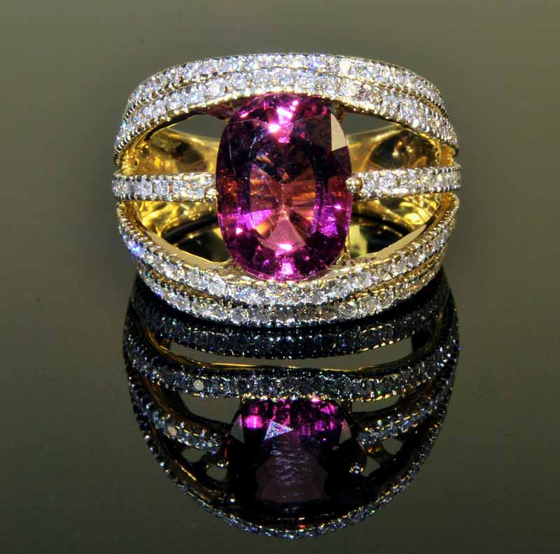 and Diamond Ring (New) The oval rubellite is set between 5 diamond set curved bands. The gallery is pierced with a central heart design -