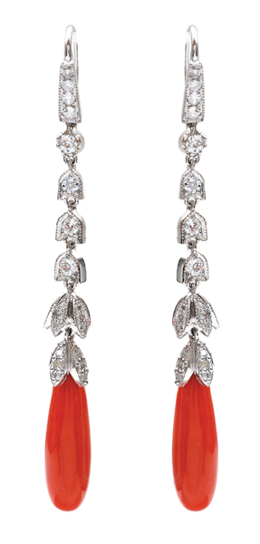 Each earring comprising an elongated coral drop, surmounted by an elaborate diamond set cap and suspended from an articulated diamond set mount, to shepherd hook fittings, in 18ct white gold. -