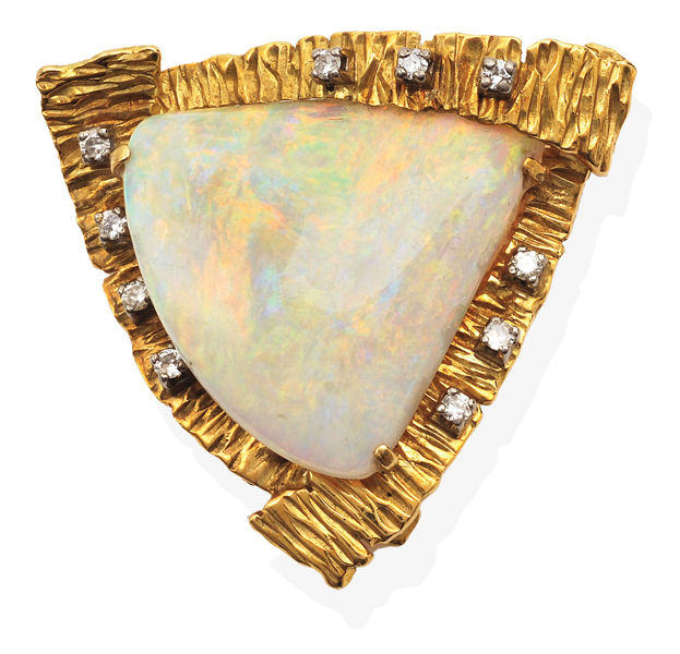 Of triangular form, the solid opal set within a textured frame with claw set diamond detail, in 18ct gold. -
