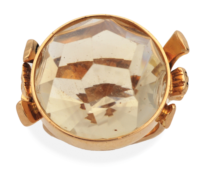 The large domed faceted citrine bezel set within sculptured shoulders, in 18ct gold, with papers, ring size M-N. -