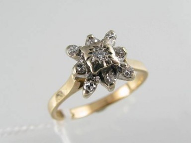 central brilliant diamond illusion set in a border of eight diamonds in 9ct gold. Estimated weight of diamonds 9 = 0.11ct. Wt 3g. -