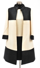 Circa 1968 Labelled 'Bernard Perris', the two peice cream woollen set comprising a sleevless shift dress with contrast quilted black vinyl turtleneck and skirt panel, together with a matching A-line coat with quilted black vinyl collar and yoke, cuffs an