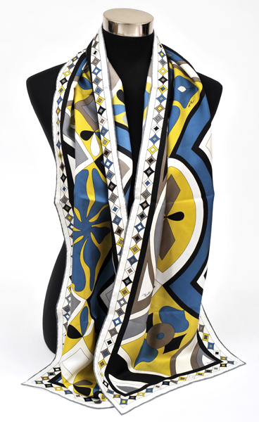 The rectangular scarf printed in a chartreuse, taupe and blue design, 32 x 175cm. -
