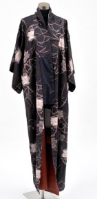 The kimono of dark violet silk with a woven ikat pattern of floral motifs, back length 152cm. -