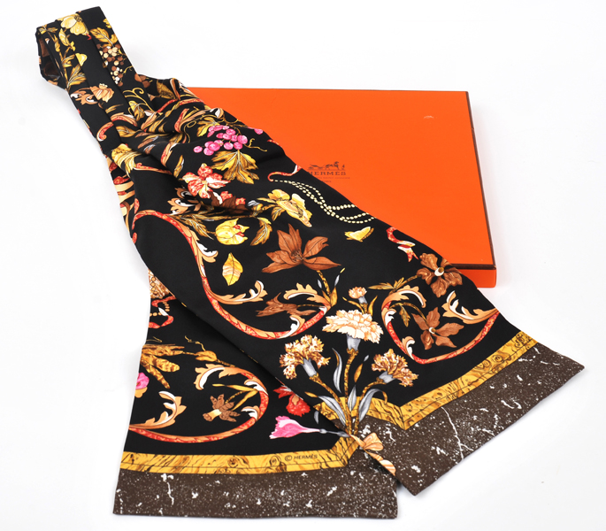 Printed with wintery foliage on a black ground, 128cm long, boxed. -