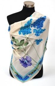 Printed with azaleas and lilacs in tonal blues on a cream ground, 85cm square. -