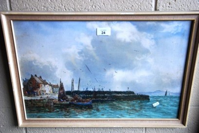 Lot #24 - C.M. Williams; watercolour of an English fishing village and jetty scene with moored fishing boats