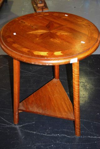 with a star marquetry inlaid circular top on 3 legs with triangular undershelf, 75cm x 60cm diameter -
