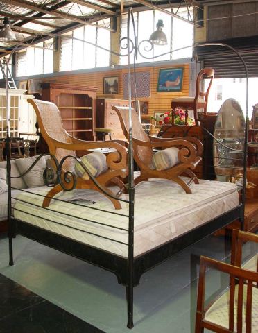 Lot Description:Hand forged wrought iron queen sized bed frame with overhead canopy section