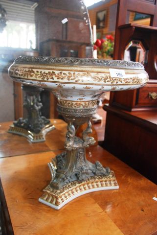 gilt floral detail on a crackle glaze with bronzed metal fittings and base, centre with 3 entwined fish -