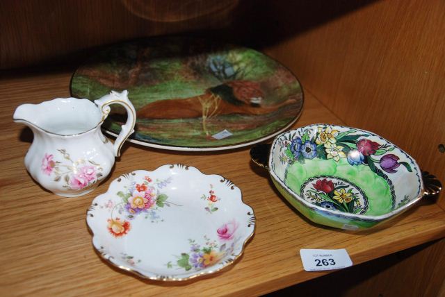 to incl. a Maling twin-handled dish with flowers on a lustre gaze, a Royal Doulton display plate, South African series lion, and 2 Royal Crown Derby items, shaped butter dish and a cream jug -
