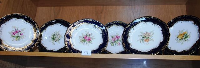 each hand painted with different flower to centre, on white ground with rich blue and hand gilded border. Plate diameter: 23cm -