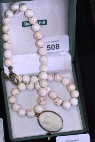 Lot #508 - White stone beaded necklace with cameo pendant