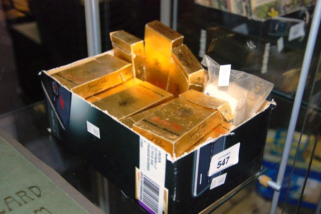 each set contained within an old cigarette box -