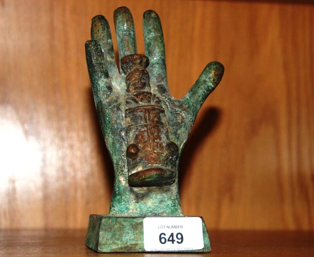 Lot Description:Heavy cast bronze statue of a hand holding a religious icon