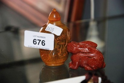 complete with lid together with a small Chinese glitter stone figure of a rabbit, chip to ear -