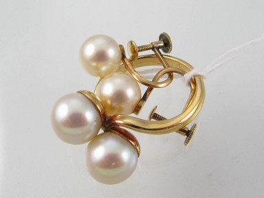 two 8.8mm pearls in 18ct gold and a pair of 8mm pearl and 14ct gold earrings; screw fittings. (2) Total weight 8g. -
