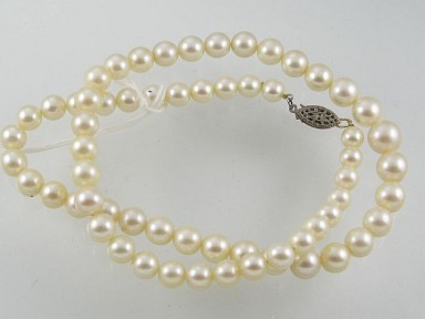 with 6.0-9.0mm graduated Akoya pearls with silver clasp. -